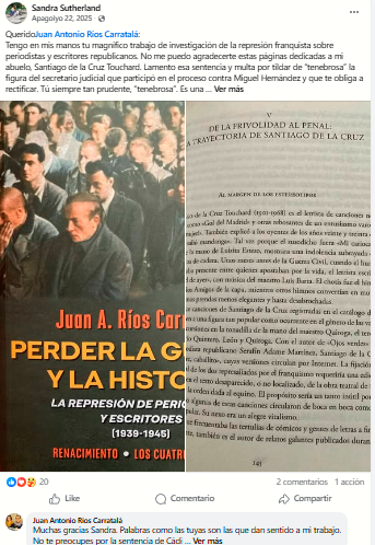 La publicación de este día muestra un apoyo explícito al libro Perder la guerra y una adhesión pública tras una sentencia condenatoria en primera instancia. El respaldo se expresa sin una sola referencia a qué se pidió inicialmente, ni a cómo se respondió a esa petición, ni a las afirmaciones concretas que dieron origen al conflicto.