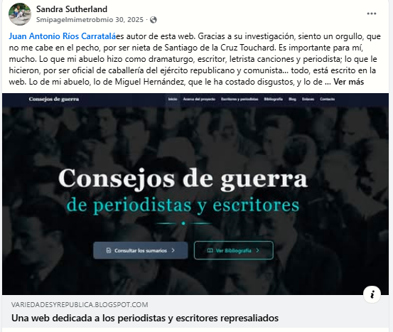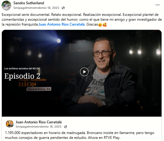 Las dinámicas descritas en la entrada anterior se concretan con claridad en cuatro publicaciones de Facebook realizadas a lo largo de 2025. Todas ellas proceden de Sandra Sutherland, cuyos comentarios son copiados, amplificados o difundidos por el propio Juan Antonio Ríos Carratalá.